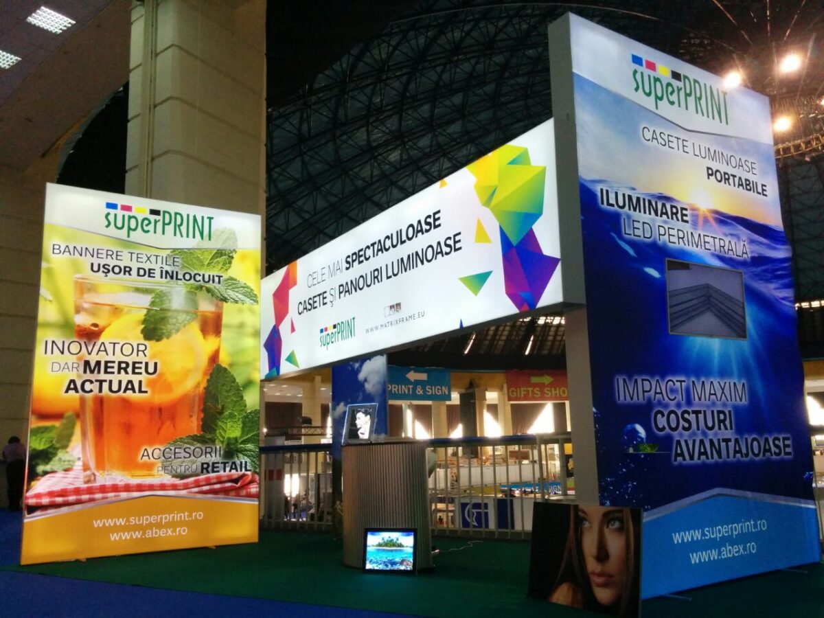 SuperPrint participa si in acest an la cel mai important eveniment din domeniu productiei publicitare – Print&Sign 2014, desfasurat in pavilionul central Romexpo intre 24-27 Septembrie. Standul nostru de la aceasta editie reprezinta o premiera in istoria participarilor la Print&Sign, fiind realizat in totalitate din casete si panouri luminoase Matrix Frame, cu dimensiuni impresionante – inaltime 4 m si latime 5 m.